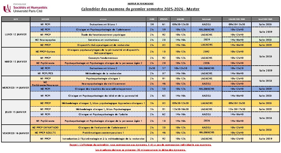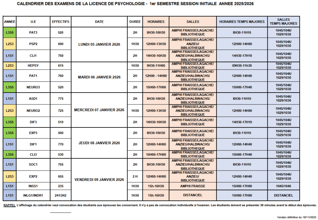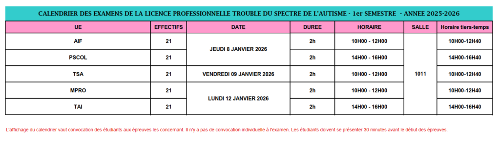 L’affichage du calendrier vaut convocation aux épreuves. Il n’y a pas de convocation individuelle aux examens.