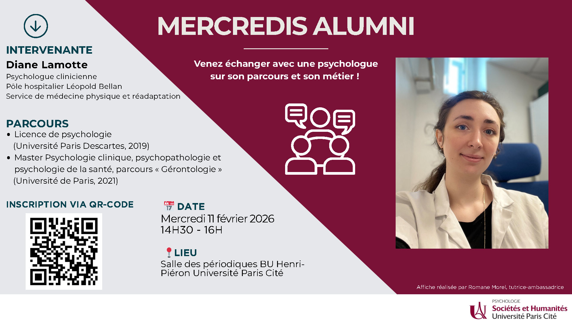 La prochaine édition des Mercredis Alumni se tiendra le mercredi 11 février 2026 de 14h30 à 16h dans la salle des périodiques de la BU Henri-Piéron. Nous recevrons Diane Lamotte, psychologue clinicienne, diplômée de l’Université Paris Cité (Master de psychologie, parcours « Psychologie gérontologique », Promotion 2021).